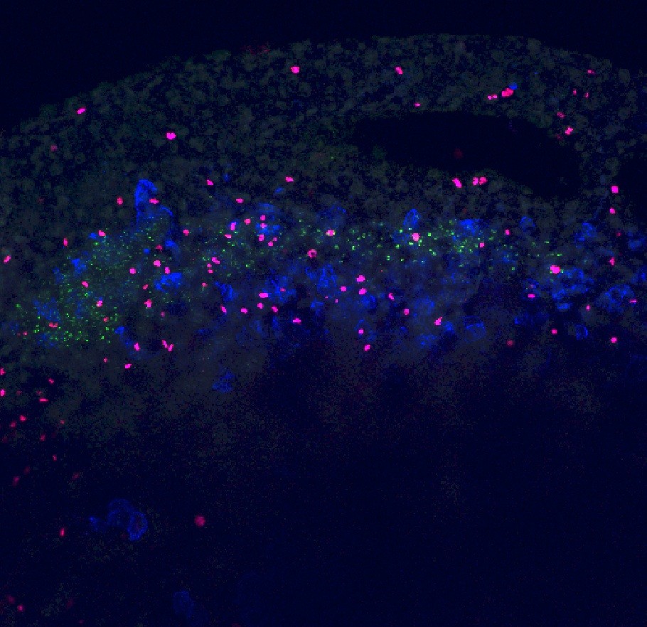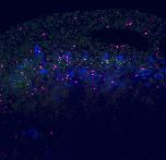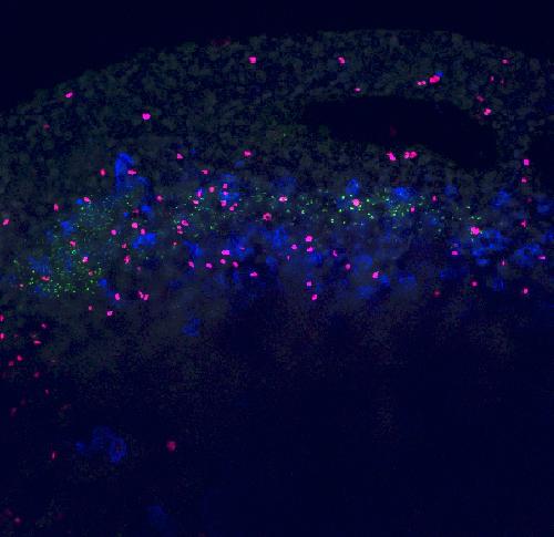 Supplemental image: does not appear in publication. GFP staining appears blue. This embryo was injected with an mRNA encoding a membrane targeted GFP. Following fluorescent in situ hybridization to detect the kidneyprimordium (green), and phospho-h3f3 antibody 1 to detect mitotic cells (magenta), the embryo was stained with invitrogen A-31852 to detect GFP derived from the injected mRNA tracer. This antibody is coupled to Alexa 647, is visualized directly, and shown in the blue channel