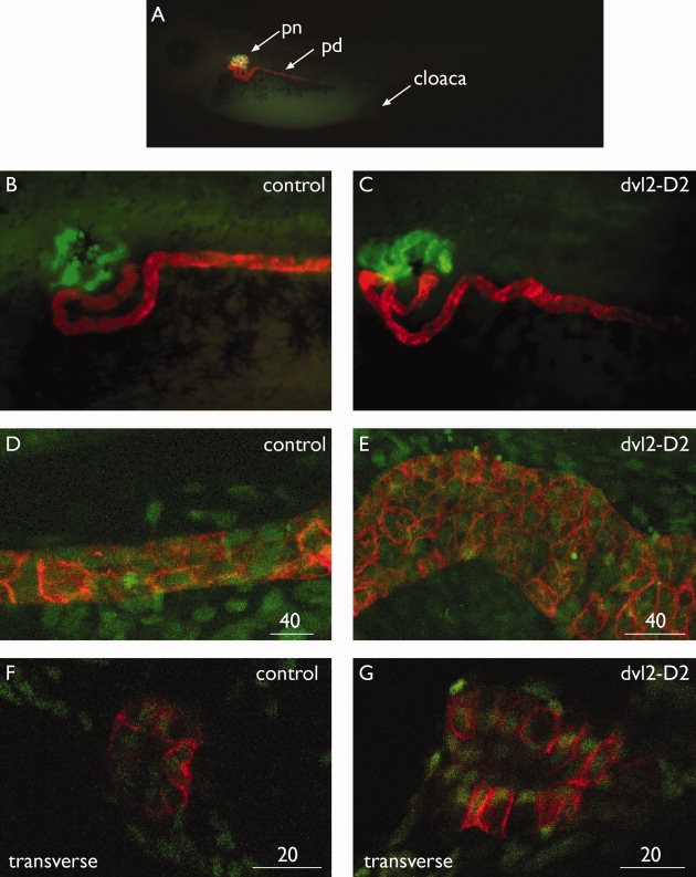 Figure 1. Dominant-negative dvl2 generates Wolffian ducts that are abnormally shaped, wider, and contain more cells than control ducts. Staining details for each technique are available in the Experimental Procedures section. A: Control embryo stained for proximal tubules in green (3G8) and the Wolffian duct in red (4A6). B: Lateral view of control stained for proximal tubules with ECL (green) and 4A6 (red). C: Dvl2-D2 mRNA-injected pronephros. The Wolffian duct is an abnormal serpentine shape. D: Confocal maximal projection of a control duct, stained with 4A6 (red) to highlight the pronephros and counterstained with sytox (green) for nuclei. E: Confocal maximal projection of dvl2-D2 mRNA-injected pronephros, stained as described in D. The duct is wider and has more cells than controls. F,G: Control and dvl2-D2 mRNA-injected ducts stained with 4A6 (red) and sytox (green) then viewed in optical transverse sections. The dvl2-D2 duct contains more cells, but both have an open lumen and normal epithelialization. pn, pronephric nephronproximal domain; pd, pronephric distal tubule and duct; cl, cloaca. Panels A through E show lateral views, while F and G illustrate transverse views. Scale bar = 40 microns in D,E, 20 microns in F,G.