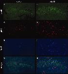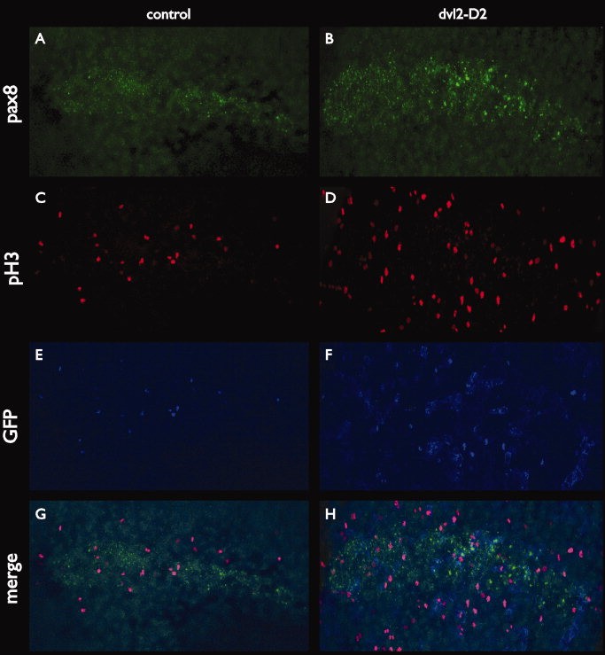 Figure 2. Microinjection of dvl2-D2 mRNA increases the number of phospho-H3 positive cells in the pronephros. Embryos were injected with dvl2-D2 plus membrane bound green fluorescent protein (GFP) mRNAs at the eight-cell stage, grown to stage 21/22, then fixed. Fluorescent in situ hybridization (FISH) was performed in the green channel to detect the pronephros (panels A and B), tyramide enhanced immunochemistry in the red channel to detect phospho-H3 (panels C and D), and tyramide enhanced immunochemistry to detect GFP in the far red channel (shown in blue). A,C,E,G: The left column shows different channels (A,C,E) of a control sample with a merge of these presented in panel G. The right column shows a similar data set for a dvl2-D2 plus GFP mRNA-injected pronephros. F,H: Due to the sequence of development some of the phospho-H3 signal also shows up in panels E and F, but is double stained and appears as magenta in panels G and H allowing the clear distinction of phospho-H3 and GFP.