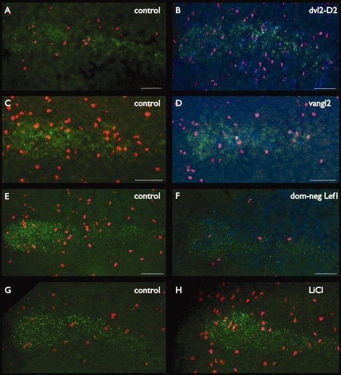 Figure 3. Inhibiting non-canonical wnt signals or promoting canonical wnt signals leads to increases in cell division, while promoting non-canonical or suppressing canonical signals results in a decrease in division rates. Controls are shown on the left, and treated embryos on the right. The pronephros is stained green by means of fluorescent in situ hybridization (FISH), dividing cells stained red by means of anti-phospho-H3, and mRNA-injected samples identified by blue green fluorescent protein (GFP) staining in all panels. Three-dimensional scanning determined which phospho-H3 positive cells were within pronephroi in each case (Table 2). AâF: Images show contralateral sides of the same embryos. G,H: Representative images with average division rates were selected as both sides of each embryo received the same treatment. Scale bars = 100 microns.
