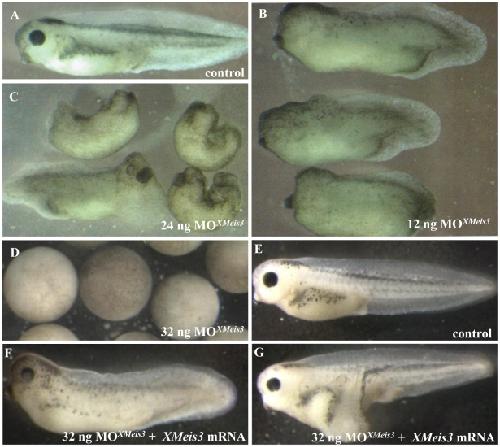 Figure 3. Effects of XMeis3 MO loss-of-function on embryonic development and the rescue of MOXMeis3.