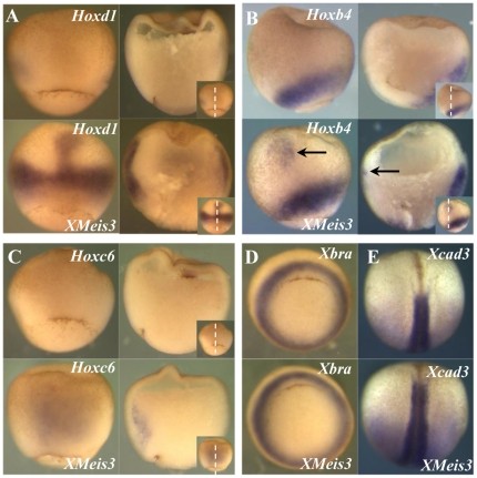 Figure 1. Expression of XMeis3, Hoxd1, Hoxb4, and Hoxc6 during gastrulation.