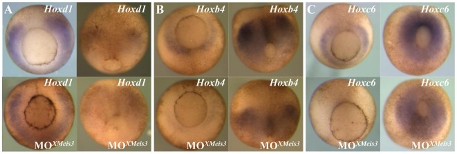 Embryos were injected at the one-cell stage with 16 ng of the MOXMeis3, and analysed by whole mount in situ hybridisation at stage 10.5/11, shown on the left side of each panel, and at stage 12, shown at the right side of each panel. Injected embryos are shown at the bottom of each panel, untreated embryos are shown on top. Shown are vegetal views with dorsal to the top. Expression of Hoxd1 (A), Hoxb4 (B), and Hoxc6 (C) is downregulated in mesoderm of injected embryos at early gastrula stages. A reduction in neurectodermal expression of the three Hox genes studied, is also observed in injected embryos at stage 12.