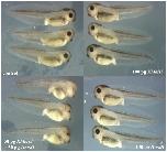 Embryos at the one-cell stage were injected into the animal hemisphere with either 100 pg Hoxd1 mRNA, 100 pg Xmeis3 mRNA, or 50 pg of both mRNA's. A single injection of 100 pg of either factor is not sufficient to induce a phenotypic effect. The combination of half the amount of Hoxd1 and XMeis3, results in posteriorisation, shown by a clear reduction of eye formation, and an anterior shift of the eye.