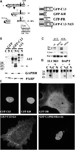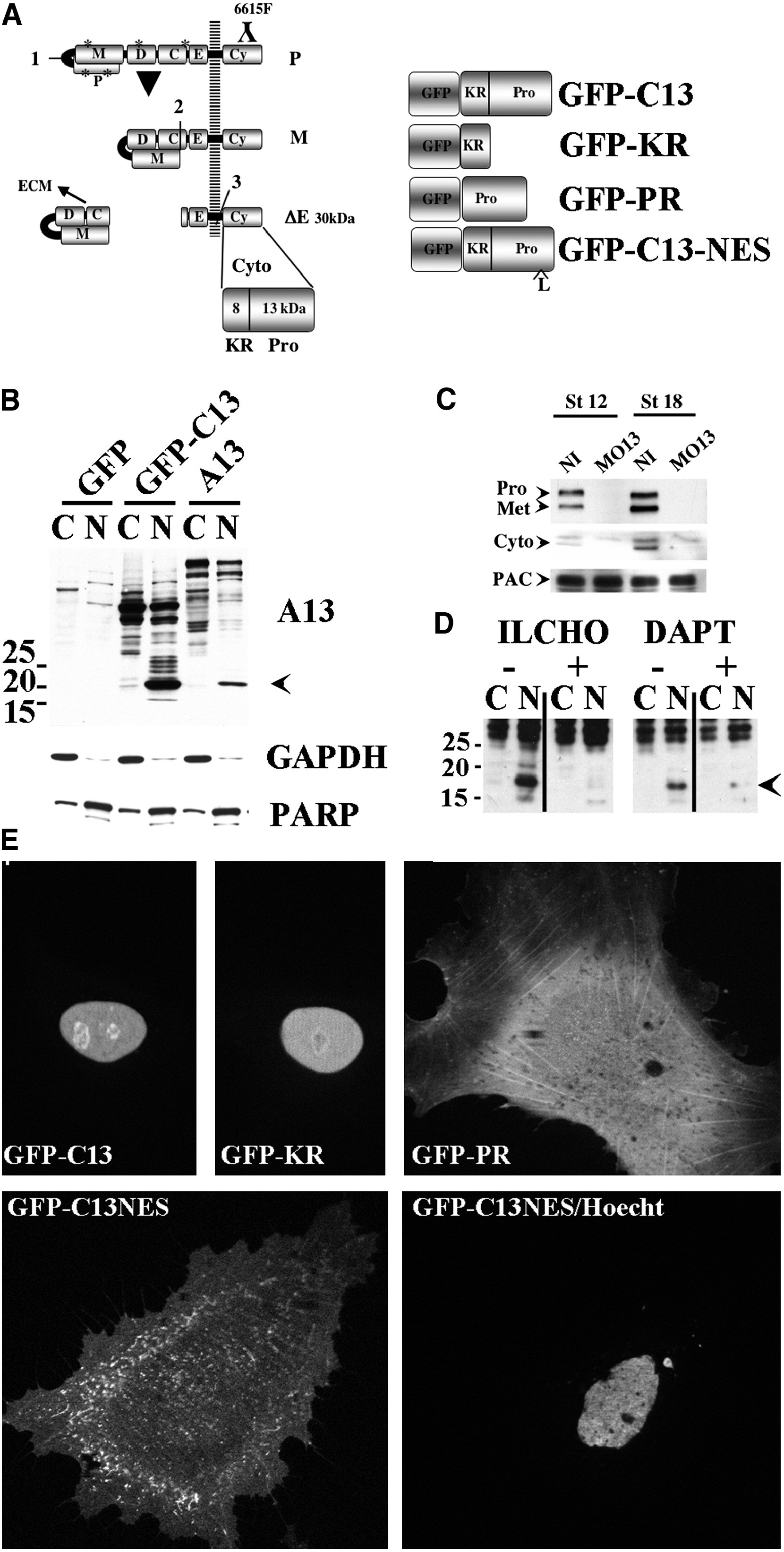 Fig.2. ADAM13 Cytoplasmic Domain Translocates to the Nucleus(A) Schematic representation of ADAM13 proteolytic processing (left). The Pro-domain is cleaved during transit to the cell surface (1). A second extracellular cleavage within the cysteine-rich domain has also been documented (2), releasing the active protease. The cytoplasmic domain is cleaved by GS (3). The GFP-fusion protein corresponding to the ADAM13 cytoplasmic domain and the various mutants are represented (right).(B) Western blot of ADAM13 cytoplasmic domain. 293T Cells were transfected with GFP, GFP-C13, and wild-type ADAM13 (A13). Cells were fractionated to generate a cytoplasmic (C) and a nuclear (N) fraction. Fractions were analyzed by western blot using a polyclonal antibody to the cytoplasmic domain of ADAM13 (arrowhead) (Alfandari et al., 1997). All membrane-bound fragments of ADAM13 are found both in the cytoplasmic fraction (plasma membrane) and in the nuclear fraction (ER attached to the nuclear membrane). The nuclear protein PARP is found in the nuclear fraction, while GAPDH is in the cytoplasm.(C) ADAM13 was immunoprecipitated from 10 embryos using a goat polyclonal antibody. Noninjected embryos (NI) at stage 12 (gastrula) and stage 18 (neurula) are compared with sibling embryos injected with MO13. The ADAM13 protein was detected using 6615F.(D) Cos-7 cells transfected with ADAM13 were treated for 4 hr with GS inhibitors (+, ILCHO 50 μM or DAPT 10 μM).(E) Localization of GFP-fusion proteins expressed in XTC cells. Hoechst was used to detect the nuclei in cells transfected with GFP-C13NES.See also Figure S2.