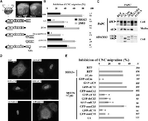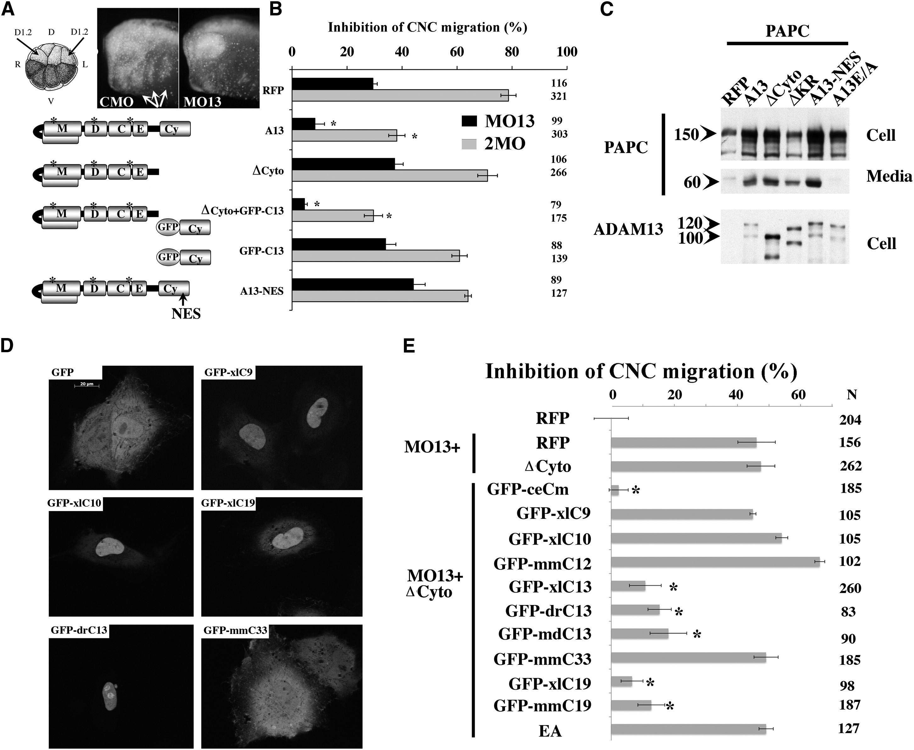Fig.3. ADAM13 Cytoplasmic Domain Is Critical for Cranial Neural Crest Cell Migration(A) Lateral view of representative embryos injected with RFP and a control MO (CMO) or with MO13 (see also Figure S4). The white arrows point to the fluorescence observed in the three main CNC segments (from left to right, Mandibular Hyoid and Branchial).(B) Histogram representing the percentage of embryos in which CNC migration was inhibited by either MO13 (black bars) or MO13 and MO19 (2MO, gray bars). The numbers on the right indicate the number of embryos scored for each construct (schematic representation to the left). Statistical significance (at least three independent experiments) was calculated using a Student's t test p < 0.05. Significant rescue is indicated with an asterisk (*), and error bars are SD.(C) Western Blot from Cos-7 cells transfected with various ADAM13 constructs and the protocadherin PAPC. The cell extract (Cell) and the glycoprotein purified from the culture supernatant (Media) were probed with an antibody to the extracellular domain of PAPC. The cell extract was also probed with the 7C9, a monoclonal antibody to the cysteine-rich domain of ADAM13.(D) Fluorescence images of live XTC cells transfected with GFP-fusion proteins corresponding to the various ADAM cytoplasmic domains. The ADAM number and the species are indicated (xl; Xenopus laevis, dr; Danio rerio, mm; Mus musculus).(E) Histogram representing the rescue experiments described in (A), using a complementation assay. The total number of embryos scored in at least three independent experiments is indicated on the right (N). Asterisk indicate significant rescue (p < 0.05), error bars are SD. The species name is indicated according to standard nomenclature (ce; Caenorhadbitis elegans, md; Monodelphis domestica).