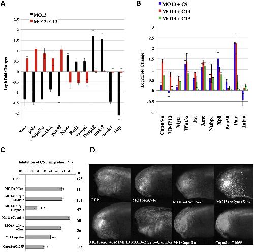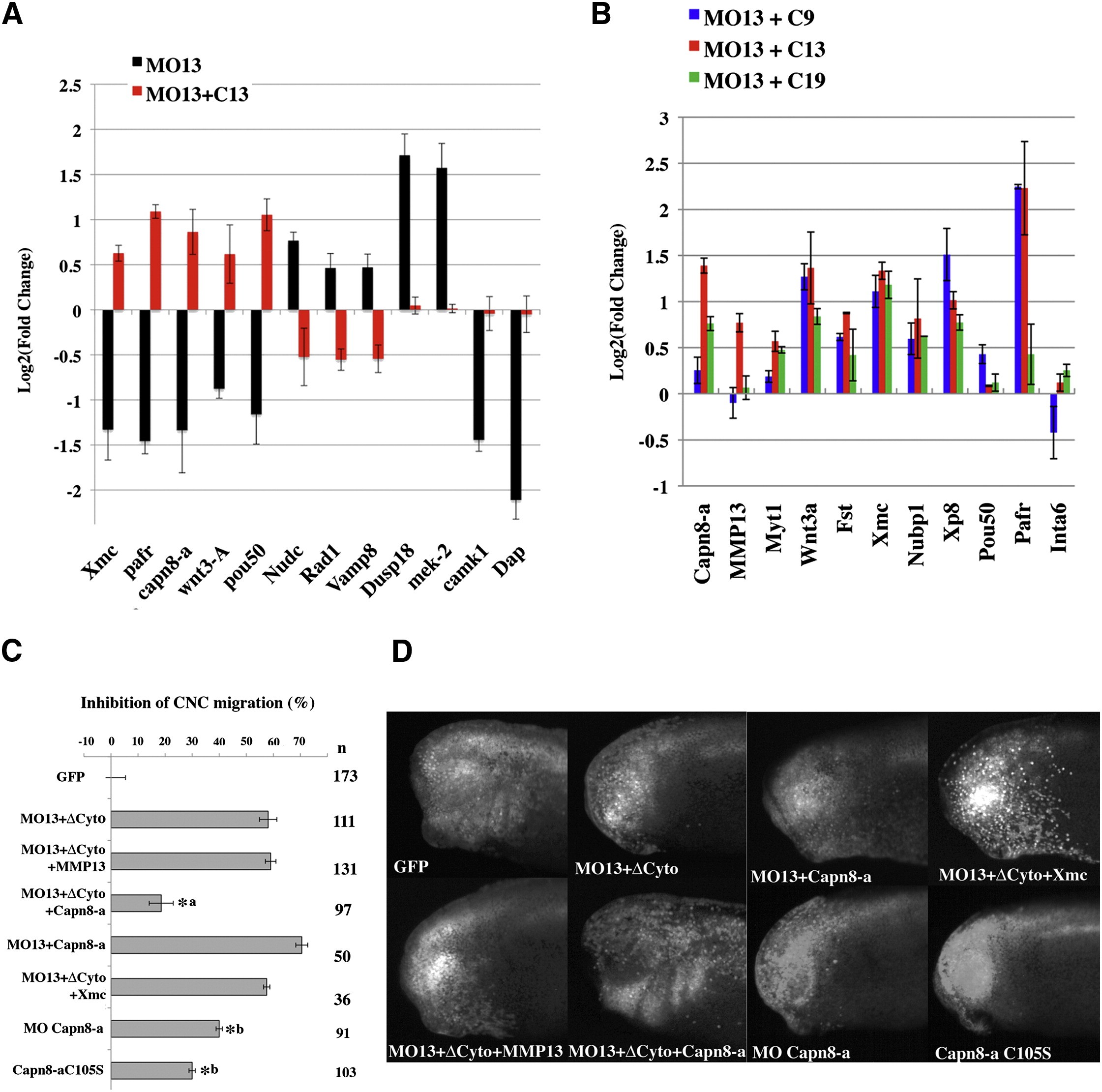 Fig.4. The Cytoplasmic Domain of ADAM13 Regulates Gene Expression(A) Representative genes were selected from the microarray data. The average fold change between the control MO and MO13 (MO13) or between MO13 and the rescue MO13 plus GFP-C13 (MO13+C13) is represented as a Log2. Error bars represent the SD. Four groups of genes are presented. Xmc (Xenopus Marginal Coil), pafr (Platelet-activating factor receptor), capn8-a (Calpain8-a), wnt3-A (Wingless-type MMTV integration site 3A), and pou50 (Pou-homeobox gene 50) are decreased in CNC injected with MO13 and are partially rescued by GFP-C13. nudc (Nuclear distribution gene C), rad1 (Cell cycle check point), and vamp8 (Vesicle-associated membrane protein 8) are increased in CNC lacking ADAM13, and rescued by GFP-C13. dusp18 (Dual specificity Phosphatase 18) and mek-2 (Erk Kinase) are increased in CNC with MO13, while camK1 (Calcium/calmodulin-dependent protein kinase 1) and dap (Death-associated protein kinase 1) are decreased, with no significant effect from GFP-C13.(B) Histogram representation of quantitative PCR data. Amplification was performed from cDNA isolated from CNC of embryos injected with either MO13 or a combination of MO13, plus the cytoplasmic domains of ADAM9 (blue), ADAM13 (red), or ADAM19 (green). Values are represented as the Log2 fold change compared with MO13 alone. Error bars correspond to the SD between triplicates. (myt1: myelin transcription factor 1, fst: follistatin, nubp1: nucleotide binding protein 1, inta6: Integrin alpha 6).(C) Complementation assays with embryos injected with MO13 plus δCyto alone or with MMP13, Calpain8-a, or Xmc. CNC migration was also measured in embryos injected with a MO to Calpain8-a or a DN Calpain8-a construct (Capn8-aC105S). The total number of embryos is given (n). Error bars correspond to the SD. Statistical analysis was done using a Student's t test. Asterisk represents p values <0.01, for (A) or <0.05 for (B). Representative examples are given in (D).