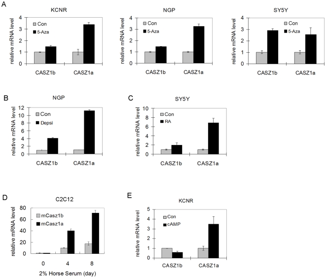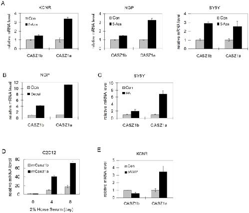 Figure 2. CASZ1a and CASZ1b are coordinately regulated.A. Neuroblastoma cell lines were treated with 2 µM demethylating agent 5-Aza-dC for 3 days. Both CASZ1a and CASZ1b mRNA levels were upregulated in KCNR, NGP and SY5Y as detected by RT-PCR using CASZ1a and CASZ1b specific primer (all p<0.02). B. NGP cells were treated with the class I histone deacetylase inhibitor, depsipeptide (5 ng/ml) for 24 hr. Both CASZ1a and CASZ1b mRNA levels were up-regulated by depsipeptide as detected by RT-PCR (all p<0.0002). C. Both CASZ1a and CASZ1b mRNA levels were up-regulated by 5 µM RA in SY5Y cells as detected by RT-PCR (all p<0.05). D. Both mCASZ1a and mCASZ1b mRNA levels were up-regulated when mouse C2C12 cells are cultured in 2% horse serum for 4 days or 8 days as detected by RT-PCR (all p<0.001). E. CASZ1b mRNA levels was down-regulated and CASZ1a mRNA levels was up-regulated by 2 µM dibutyryl cyclic AMP treatment for 48 hr in KCNR cells as detected by RT-PCR (all p<0.05).
