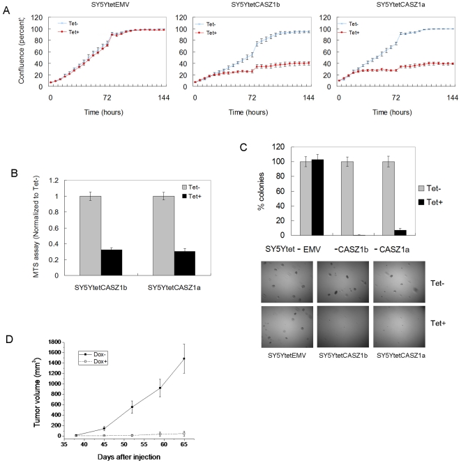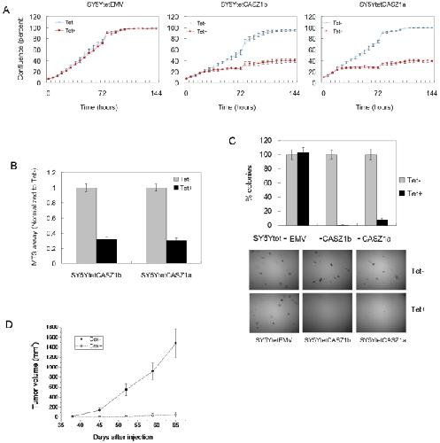 Figure 6. Like CASZ1a, CASZ1b suppresses neuroblastoma cell growth.A. Induction of CASZ1b by Tet in SY5YtetCASZ1b cells inhibited cell growth, and the magnitude of inhibition was similar to CASZ1a in SY5YtetCASZ1a cells. The cell confluence was measured at different time point using IncuCyte instrument (P<0.05 for all time points since day 2). B. Similar to CASZ1a, the induction of CASZ1b by Tet inhibited proliferation of SY5YtetCASZ1b cells as assessed using a MTS assay on day 7 (p<0.005). C. Similar to CASZ1a, the induction of CASZ1b by Tet decreased clonogenicity of SY5YtetCASZ1b cells in soft agar (p<0.005). D. SY5YtetCASZ1b cells were subcutaneously injected into nude mice. The induction of CASZ1b expression significantly inhibited tumor growth in the xenograft model (n = 5 mice per group, total 10 mice; Volume = long × short2/4; data are shown as mean ± SEM, all time point p<0.02 since day 45).