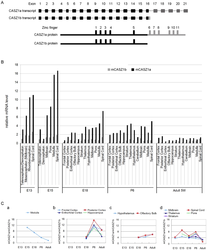 Figure 1. Mouse CASZ1a (mCASZ1a) and CASZ1b (mCASZ1b) co-exist during neurogenesis and exhibit different patterns of expression.A. CASZ1a and CASZ1b transcript structure (top). Exon 16 is differently spliced to produce these two transcripts; CASZ1a and CASZ1b protein structure (bottom); CASZ1b lacks the C-terminal region of CASZ1a, which includes 6 zinc fingers. B. mCASZ1a and mCASZ1b mRNA level in neuronal tissues were detected by real time PCR using mCASZ1a and mCASZ1b specific primers. The two isoforms are dynamically expressed in the nervous system during development with mCASZ1a having a relatively higher level of expression compared to mCASZ1b. C. The ratio of mCASZ1a and mCASZ1b mRNA varied during development in different regions of the brain: a. Medulla; b. Frontal, Posterior, Enthorithinal cortex and Hippocampus; c. Hypothalamus, Olfactory bulb; d. Midbrain, Spinal cord, Thalamus, Pons and Striatum.
