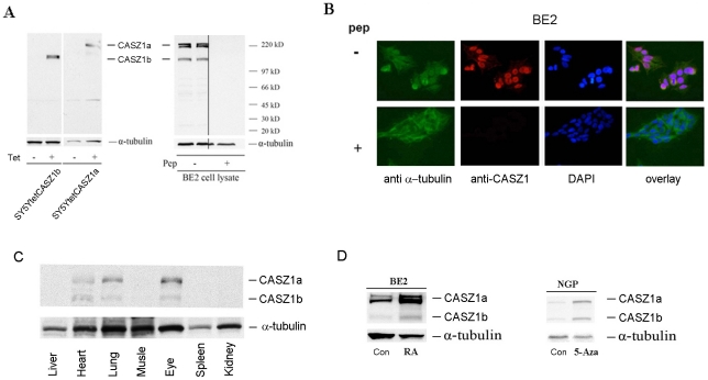 Figure 3. CASZ1a and CASZ1b are co-expressed and coordinately regulated at the protein level.A. Anti-CASZ1 antibody is specific to CASZ1a and CASZ1b. Induction of CASZ1a and CASZ1b expression in the SY5YtetCASZ1a and SY5YtetCASZ1b clones by Tet at 24 hours was visualized by immunoblotting the cell lysates with anti-CASZ1 antibody (left); endogenous CASZ1a and CASZ1b expression in neuroblastoma cells was visualized by immunoblotting the BE2 cell lysates with anti-CASZ1 antibody, and the specificity of the antibody was demonstrated by pre-incubation of immunizing peptide and loss of CASZ protein recognition with immunoblotting analysis (right). B. Endogenous CASZ1a and CASZ1b are predominantly expressed in the nucleus of neuroblastoma cells. The nuclear localization of CASZ1a and CASZ1b was characterized by the co-localization of Alex 568-labeled goat anti-mouse IgG and DAPI-stained nucleus of BE2 cells (top), and the specificity of the antibody was demonstrated by the blocking effect of antigen peptide on antibody recognition with immunoblotting analysis (bottom). C. The co-expression of murine CASZ1a and CASZ1b protein in heart, lung and eye of P6 mouse was visualized by immunoblot analysis of tissue lysates using an anti-CASZ1 antibody. D. The simultaneous up-regulation of CASZ1a and CASZ1b protein by either RA or 5-Aza-dC in neuroblastoma cell lines was visualized by immunoblot analysis of the cell lysates using the anti-CASZ1 antibody.