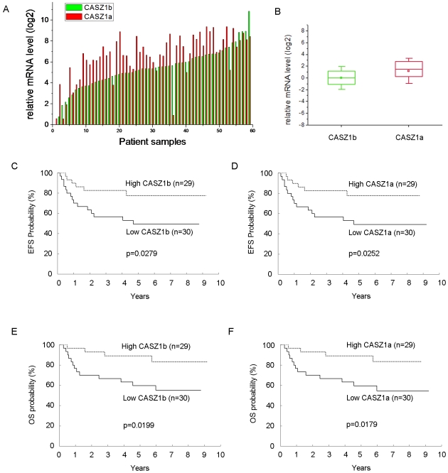 Figure 5. Loss of either CASZ1b or CASZ1a expression is correlated with poor prognosis in neuroblastoma.A. CASZ1a and CASZ1b have similar expression patterns in primary neuroblastoma samples. B. The average of CASZ1a mRNA level is about 2-fold higher than CASZ1b (p<0.002). C. Kaplan-Meier curves of EFS for low (<0.9468) vs. high (≥0.9468) CASZ1b expression in 59 neuroblastoma patients. D. Kaplan-Meier curves of EFS for low (<0.9195) vs. high (≥0.9195) CASZ1a expression in 59 neuroblastoma patients. E. Kaplan-Meier curves of OS for low (<0.9468) vs. high (≥0.9468) CASZ1b expression in 59 neuroblastoma patients. F. Kaplan-Meier curves of OS for low (<0.9195) vs. high (≥0.9195) CASZ1a expression in 59 neuroblastoma patients (all p<0.05).