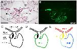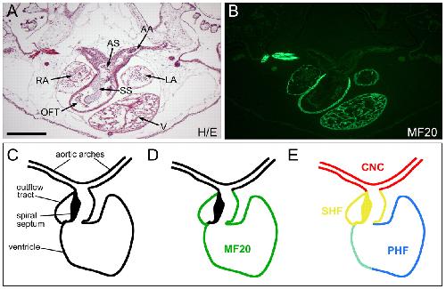 Fig. 7. The relative contribution of the cardiac NC and SHF to the Xenopus cardiovascular system. (A) Hematoxylin and Eosin (H/E) staining of a transverse section through the heart of a stage 50 embryo. AA, aortic arch arteries; AS, aortic sac; LA, left atrium; OFT, outflow tract; RA, right atrium; SS, spiral septum; V, ventricle. Scale bar: 100 μm. (B) An adjacent section stained with MF20 antibody highlights the very sharp boundary between the muscle cells in the myocardium of the outflow tract and the aortic sac. (C) The Xenopus developing heart. (D) The muscle marker MF20 is expressed in muscle cells of the myocardium, including outflow tract and ventricle, but is excluded from the spiral septum. (E) The structures derived from the cardiac NC (CNC, red), the SHF (yellow) and the PHF (blue) are indicated based on our findings. PHF and SHF overlapping regions that result from the incomplete segregation of the two heart fields at the time of transplantation are in green.