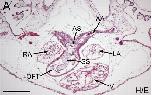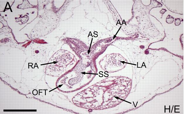 Hematoxylin and Eosin (H/E) staining of a transverse section through the heart of a NF stage 50 Xenopus embryo. AA, aortic arch arteries; AS, aortic sac; LA, left atrium; OFT, outflow tract; RA, right atrium; SS, spiral septum; V, [cardiac] ventricle. Scale bar: 100 μm.