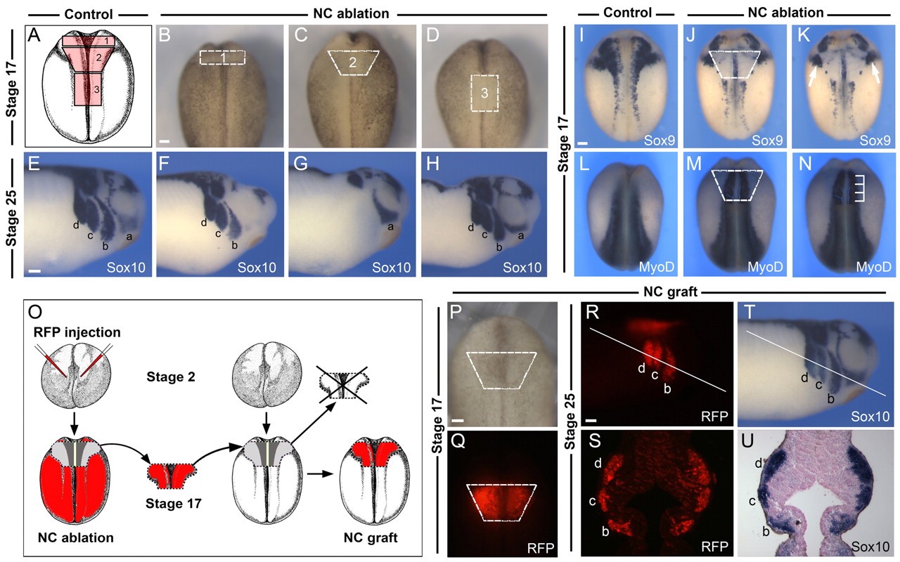Fig. 1. Position of the putative cardiac neural crest and experimental design to analyze its contribution to the cardiovascular system. (A) Diagram of a neurula stage Xenopus embryo (stage 17) viewed from the dorsal side (anterior to top), with outline of the segments of the neural crest (NC) ablated along the anteroposterior axis (1-3). (B-D) Stage 17 embryos with the region of the three ablated NC domains indicated. (E-H) In situ hybridization for the NC marker Sox10 in control and NC-ablated embryos at stage 25. (E) In control embryos, Sox10 is expressed within the four streams of the migrating cranial NC: the mandibular (a), hyoid (b), anterior branchial (c) and posterior branchial (d) NC. (F) After ablation of NC domain â#1â, the most anterior NC stream (a) is lost. (G) Ablation of NC domain â#2â results in loss of the three most posterior NC streams, without affecting the more anterior mandibular NC stream (a). (H) After ablation of NC domain â#3â, all four streams of the migrating cranial NC form normally. (I-N) Position of the ablated/transplanted NC domain at stage 17 with respect to adjacent tissues. The presumptive otic placode (I-K) as revealed by Sox9 expression (arrows) is unaffected after NC ablation. The ablated NC domain spans a region extending from the first to the fourth somite (L-N) as revealed by MyoD expression (brackets). (O) Experimental design to analyze NC contribution to the cardiovascular system. Two-cell stage embryos were injected in the animal pole with mRNA encoding RFP. At stage 17, the RFP-labeled NC is transplanted onto the equivalent region of an unlabeled host embryo (NC graft). (P,Q) RFP-labeled NC graft at stage 17. (R-U) At stage 25, cells derived from the RFP-labeled NC graft are confined to the three most posterior streams of cranial NC (b, c and d), and completely overlap with Sox10 expression as seen in the whole embryo (R,T) and in sections (S,U). The line in R and T indicates the level of the sections shown in S and U, respectively. Scale bars: 100 μm.