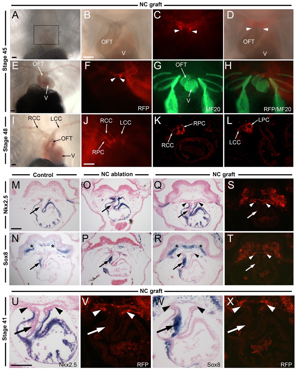 Fig. 2. RFP-labeled NC contributes to the aortic sac and arch arteries and is dispensable for outflow tract septation. (A-D) Cells derived from a stage 17 RFP-labeled NC graft populate the wall of the aortic arch arteries at stage 45 and never populate the outflow tract (OFT). B-D are a higher magnification of the boxed area in A. Ventral views, anterior to top. (E-H) Four views of the same Xenopus embryo showing that the RFP-positive cells form a very sharp boundary (arrowheads) and do not overlap with the myocardium muscle cells, as labeled with MF20 antibody. (I-L) At stage 48, RFP-labeled NC-derived cells are confined to the large arteries (LCC, left carotid canal; LPC, left pulmocutaneous canal; RCC, right carotid canal; RPC, right pulmocutaneous canal) as seen in the whole embryo (J) and in sections (K,L). (M-X) Transverse sections of stage 41 embryos showing Nkx2.5 and Sox8 expression in control and manipulated embryos. (M-N) In control embryos, Nkx2.5 is expressed throughout the myocardium [outflow tract and ventricle (V)], whereas Sox8 is confined to the spiral septum (arrows). Sox8 is also detected in the NC-derived head mesenchyme (asterisks). (O-P) NC ablation does not prevent outflow tract septation as revealed by Sox8 expression (arrows). These embryos lack the aortic sac, resulting in a dorsal expansion of Nkx2.5. (Q-T) The RFP-labeled NC-derived cells are detected in the aortic sac and arch arteries (arrowheads) but not in the spiral septum of the outflow tract (arrows). U-X are higher magnification views of Q-T. Scale bars: 100 μm.