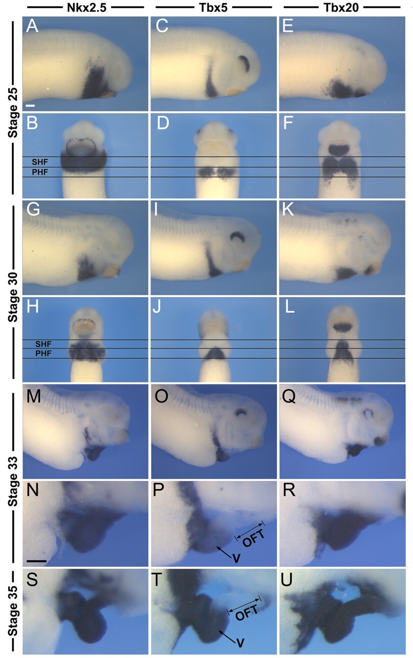 Fig. 3. Molecular characterization of the primary and second heart fields. (A-U) Developmental expression of Nkx2.5, Tbx5 and Tbx20 at stages 25, 30, 33 and 35 as indicated. The horizontal lines indicate the predicted position of primary heart field (PHF) and second heart field (SHF). All three genes are detected in the PHF, whereas the SHF expresses both Nkx2.5 and Tbx20 but is negative for Tbx5 expression. At later stages, the developing outflow tract (OFT), a derivative of the SHF, remains Tbx5 negative. (A,C,E,G,I,K,M-U) Lateral views, anterior to right. (B,D,F,H,J,L) Ventral views, anterior to top. V, ventricle. Scale bars: 100 μm.