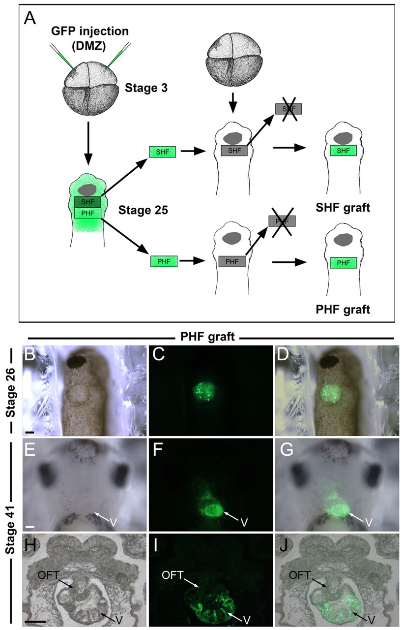 Fig. 4. The PHF contributes to the ventricle. (A) Experimental design to analyze the relative contribution of the PHF and SHF to the developing heart. Four-cell stage Xenopus embryos were injected in the dorsal marginal zone (DMZ) with mRNA encoding GFP. At stage 25, the GFP-labeled PHF or SHF was transplanted onto the equivalent region of an unlabeled host embryo (PHF graft or SHF graft). (B-D) Ventral view (anterior to top) of a host embryo at stage 26 shows the position of GFP-labeled PHF graft. (E-G) At stage 41, the GFP-labeled PHF-derived cells are detected in the developing heart. Ventral view, anterior to top. (H-J) In a transverse section, the GFP-labeled PHF-derived cells are largely confined to the ventricle. OFT, outflow tract; V, ventricle. Scale bars: 100 μm.