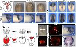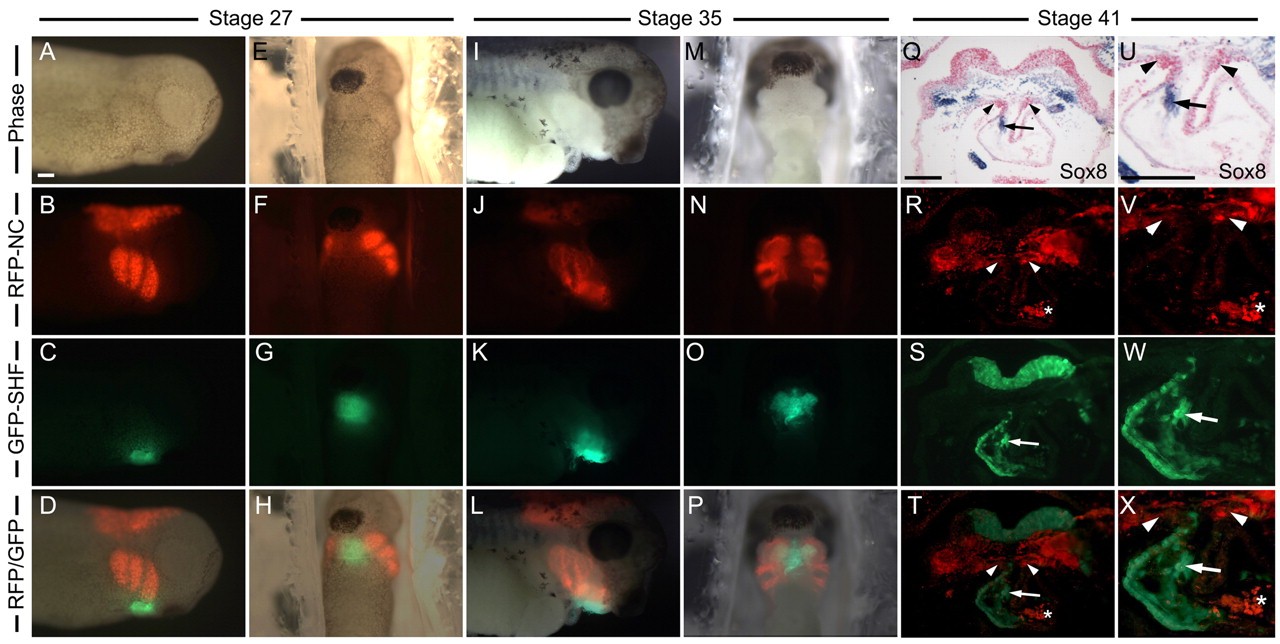 Fig. 6. The NC and SHF contribute to distinct, non-overlapping lineages of the cardiovascular system. (A-X) RFP-labeled NC and GFP-labeled SHF were sequentially transplanted into the same unlabeled host Xenopus embryo at stage 17 and stage 25, respectively. The progeny of the labeled grafts were analyzed at different time points, in the whole embryo at stage 27 (A-H) and stage 35 (I-P) and on sections at stage 41 (Q-X). (A-D,I-L) Lateral views, anterior to right. (E-H,M-P) Ventral views, anterior to top. Sox8 expression at stage 41 is detected in the spiral septum (black arrow), a tissue derived from the GFP-labeled SHF (white arrows). GFP-labeled SHF also contributes to the wall of the outflow tract and to the proximal part of the ventricle. RFP-labeled NC-derived cells are detected in the aortic arch arteries (arrowheads) and in the NC-derived head mesenchyme. Red blood cells in the ventricle show non-specific autofluorescence (asterisks). U-X are higher magnification views of Q-T. Scale bars: 100 μm.