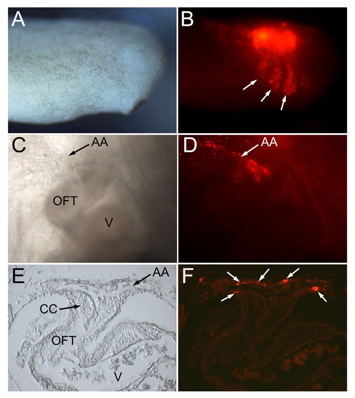 Fig. S1. DiI fate mapping of the cardiac NC at stage 17/ (A,B) At stage 27, DiI-labeled NC cells are populating the branchial arches (arrows). Lateral view, dorsal to top, anterior to right. (C,D) Ventral view of a stage 45 embryo showing the restriction of the DiI-positive cardiac NC cells to the aortic arch artery on the right side. (E,F) Transverse sections of a stage 45 embryo. The DiI-positive cardiac NC cells are confined to the aortic sac and arch arteries (arrows) and never populate the cardiac cushions. Brightfield (A,C,E) and fluorescence (B,D,F) images are shown. AA, aortic arch; CC, cardiac cushion; OFT, outflow tract; V, ventricle.