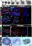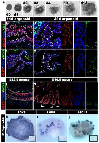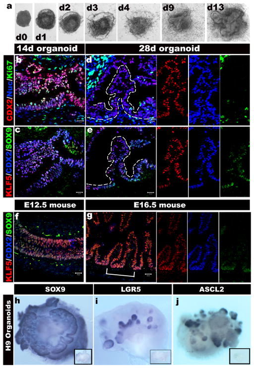 Figure 3. hESCs and hiPSCs form 3-dimensional intestine-like organoidsa, A time course shows that intestinal organoids formed highly convoluted epithelial structures surrounded by mesenchyme after 13 days. b-e, Intestinal transcription factor expression (KLF5, CDX2, SOX9) and cell proliferation on serial sections of organoids after 14 and 28 days (serial sections are b and c, d and e). f and g, Expression of KLF5, CDX2, and SOX9 in mouse fetal intestine at e14.5 (f) and e16.5 (g) is similar to developing intestinal organoids. The right panels show separate color channels for d, e and g. h, i and j, whole mount in situ hybridization of 56 day old organoids showing epithelial expression of Sox9 (h) and restricted “crypt-like” expression of the stem cell markers Lgr5 (i) and Ascl2 (j). Insets show sense controls for each probe.