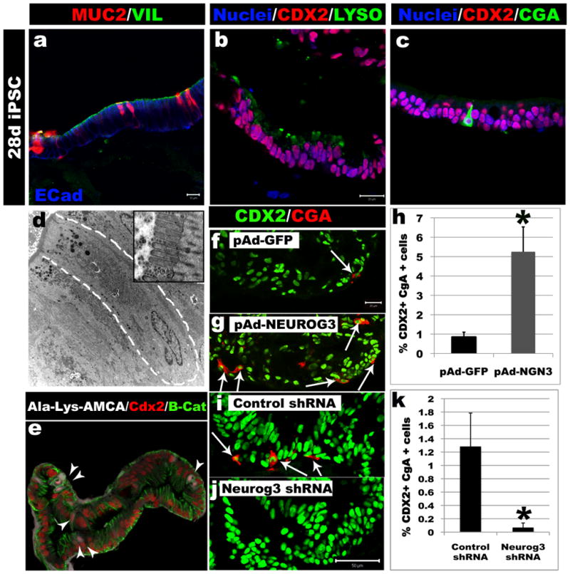 Figure 4. Formation and function of intestinal cell types and regulation of enteroendocrine differentiation by NEUROG328 day iPSC-derived organoids were analyzed for a, villin (VIL) and the goblet cell marker mucin (MUC2), b, the paneth cell marker lysozyme (LYSO) or c, the endocrine cell marker chromogranin A (CGA). d, Electron micrograph showing an enterocyte cell with a characteristic brush border with microvilli (inset). e, Epithelial uptake of the fluorescently labeled dipeptide d-Ala-Lys-AMCA (arrowheads) indicating a functional peptide transport system. f-h, Adenoviral expression of Neurog3 (pAd-NEUROG3) causes a 5-fold increase in CGA+ cells compared to a GFP control (pAd-GFP); (n=4 biological samples);*(p=0.005). i-k, Organoids were generated from hESCs that were stably transduced with shRNA-expressing lentiviral vectors. Compared to control shRNA organoids, NEUROG3 shRNA organoids had a 95% reduction in the number of CgA+ cells; (n=3 for shRNA controls and n=5 for Neurog3-shRNA); *(p=0.018). Error bars for h,k are S.E.M.