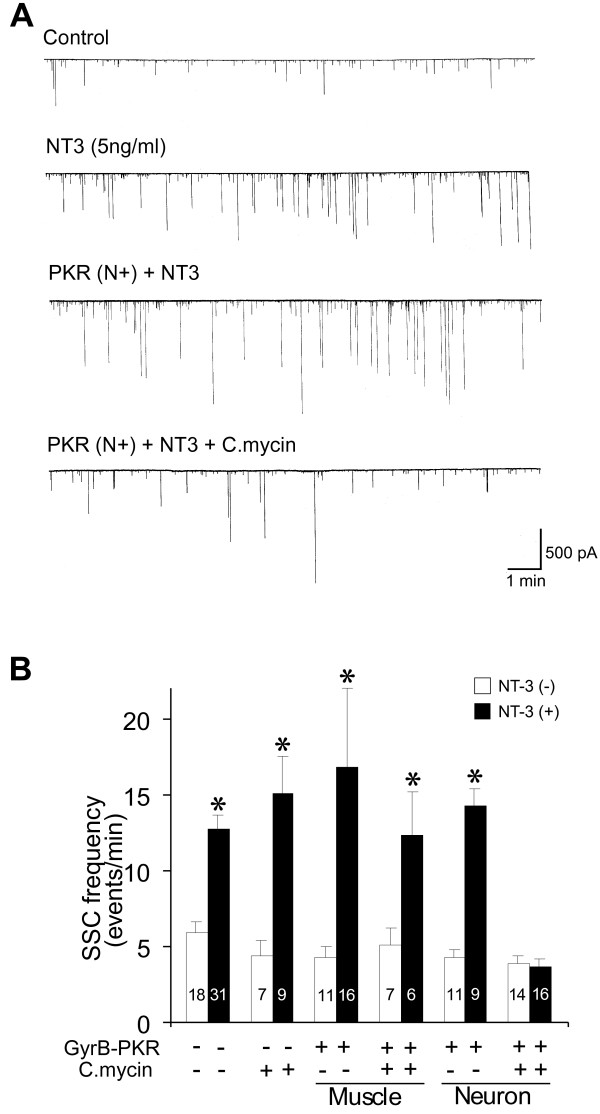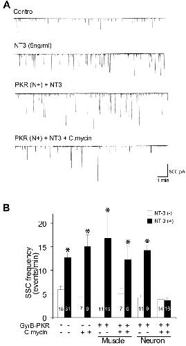 Figure 4. Blockade of the long-term synaptic effect of NT-3 by C.mycin -induced PKR activation. (A) Sample recordings showing long-term synaptic potentiation by NT-3. The Xenopus nerve-muscle co-cultures were grown in the presence or absence of NT-3 (5 ng/ml) for 2 days. Expression of GyrB-PKR alone did not prevent NT-3-mediated long-term synaptic potentiation. However, application of C.mycin to synapses expressing GyrB-PKR presynaptically completely prevented long-term synaptic potentiation by NT-3. (B) Summary of long-term effect on NT-3 on synapses without GyrB-PKR expression, and synapses with pre- or post-syanptic expression of GyrB-PKR. Each data point represents SSCs frequency (averaged from 30 min of recording) form a single synapse with or without coumermycin treatment. Note that application of C.mycin alone could not attenuate the increase in SSC frequency by NT-3 chronic treatment. Application of C.mycin to synapses expression GyrB-PKR presynaptically, but not postsynaptically, completely prevented long-term synaptic effect of NT-3. The number associated with each column represents the number of cells analyzed. Data are presented as the mean ± the SEM.