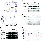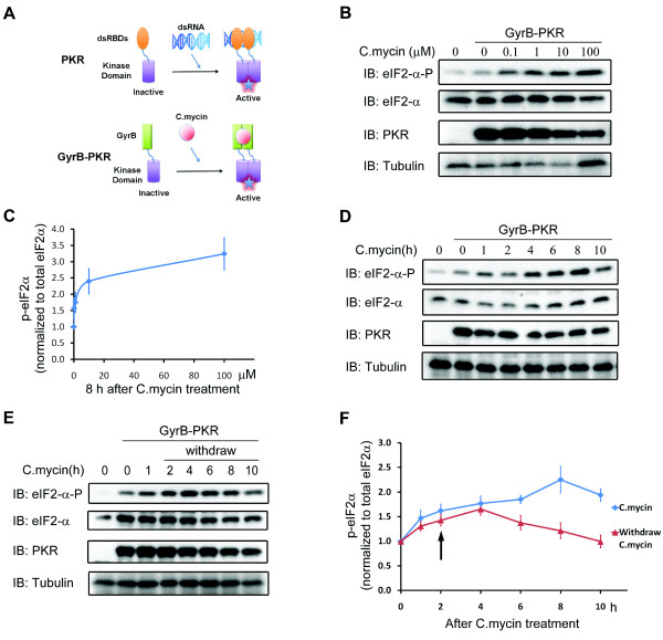 Figure 1. Phosphorylation of eIF2α upon coumermycin-induced GyrB-PKR dimerization. (A) Schematic diagrams showing the fusion of PKR kinase domain with coumermycin-binding domain of GyrB. Application of coumermycin (C. mycin) induces the dimerization of the PKR fusion proteins and activates PKR, triggering eIF2α phosphorylation and subsequent de novo protein synthesis inhibition. (B) Representative blots showing C.mycin-induced phosphorylation of eIF2α on Ser51 in Xenopus embryos expressing GyrB-PKR. Embryos were treated with various concentrations of coumermycin for 8 hours, harvested and lysed. Western blotting was performed using specific antibodies as indicated. The blots were also probed with anti-eIF2α and anti-tubulin antibody for loading controls. (C) Quantification of eIF2α phosphorylation with different C.mycin concentrations. (D) Time course of eIF2α phosphorylation induced by 1 μM Coumermycin. (E) Time course of eIF2α phosphorylation upon 1 μM C.mycin treatment and withdrawal. Embryos were treated with Coumermycin for 2 hours and washed with culture medium without C.mycin (F) Quantification of eIF2α phosphorylation with or without C.mycin at different time points. Arrow indicated the time point of withdrawing C.mycin. Note the eIF2α phosphorylation level goes back to the baseline within 8 hours. Multiple blots were quantified (N = 6), and eIF2α-P signals at various time points were normalized to that at 0 hour.