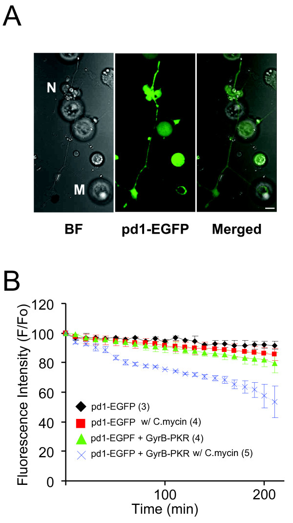 Figure 2. Inhibition of protein translation in spinal neurons by C.mycin -induced GyrB-PKR dimerization. (A) Expression of the pd1-EGFP in Xenopus spinal neurons. Bright field, fluorescent, and merged images (left, middle, right, respectively) show a spinal neuron and muscle cells expressing pd1-EGFP. N: neuron; M: muscle cell. Bar, 10 μm. (B) Quantification of fluorescence change on neurons. Pd1-EGFP was expressed either alone or together with GyrB-PKR in Xenopus spinal neurons, using embryo injection techniques. C.mycin was applied to the culture dish at time "0", and pd1-EGFP fluorescence was monitored over time. The number of experiments performed was indicated in the legend.