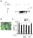 Figure 3. Normal acute synaptic potentiation by NT-3 in GyrB-PKR activated neuromuscular synapses. (A) Sample recordings showing acute synaptic potentiation by NT-3. NT-3 (50 ng/ml) was applied directly to 1-day-old nerve-muscle co-culture. The frequency of spontaneous synaptic currents (SSCs) was used to monitor changes in synaptic efficacy. (B) A sample image showing neuromuscular synapses in which muscle cells are innervated by a GFP expressing spinal neuron. N: neuron axon (neuron body is out of this image); M: muscle cell. Bar, 10 μm. (C) Summary of acute effect of NT-3 on synapses without GyrB-PKR expression, and synapses with presynaptic or postsynaptic expression of GyrB-PKR. Each data point represents SSCs frequency (averaged from 30 min of recording) from a single synapse before C.mycin and after NT-3 application. Note that the application of coumermycin did not affect the baseline of recording. The number associated with each column represents the number of cells analyzed. Data are presented as the mean ± the SEM.