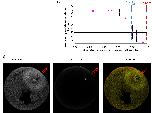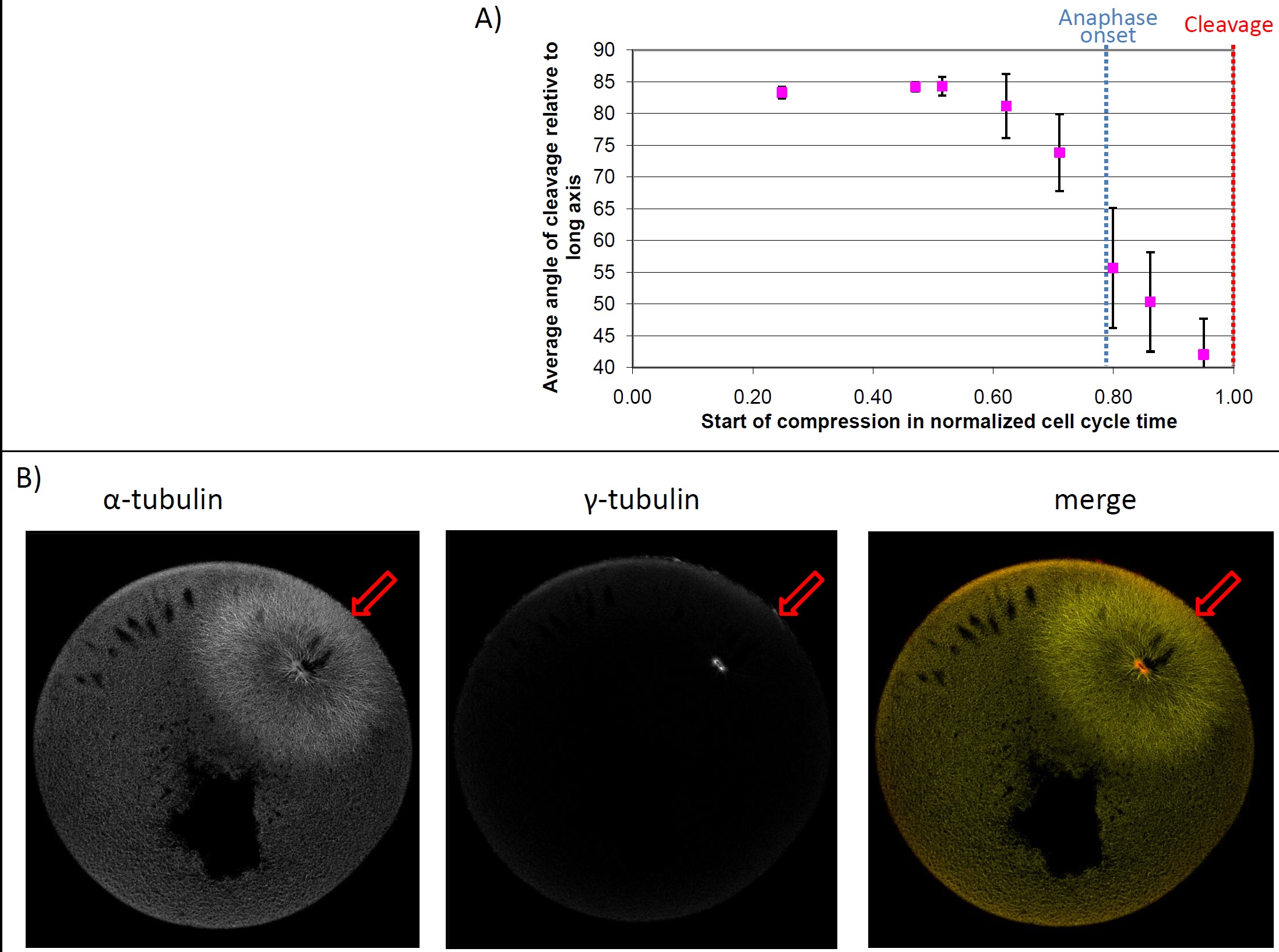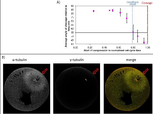 Figure S1. Related to Figure 1. A) Cleavage plane orientation is mostly determined before anaphase/telophase: Xenopus laevis embryos were fertilized and compressed at various time points between glass plates 0.8 mm apart. Each point represents the start of deformation and the resulting average cleavage angle relative to the glass plates with standard error of the mean (angles were defined between 0° as parallel to and 90° as perpendicular to glass plates). Time was normalized relative to first cleavage (t=1). The embryos mostly lose their ability to reorient the directly following cleavage plane relative to the artificially introduced longest axis before anaphase onset which we determined by Immunofluorescence at t ~ 0.79 (blue line). B) The tendency of the first cleavage plane to cut through the sperm entry point can be explained with the initial long axis of the sperm aster. Immunofluorescence of a Xenopus laevis embryo against α- and γ-tubulin of the sperm aster 35 min post fertilization at 18° C. The sperm entered from the periphery (approximated by arrow), the growth of the sperm aster is restricted by the close by cortex resulting in an elongated aster, with the longest axis parallel to the tangent of the sperm entry point. The centrosomes and the later first mitotic spindle orient with this long axis, resulting in a cleavage plane that cuts near the sperm entry point.