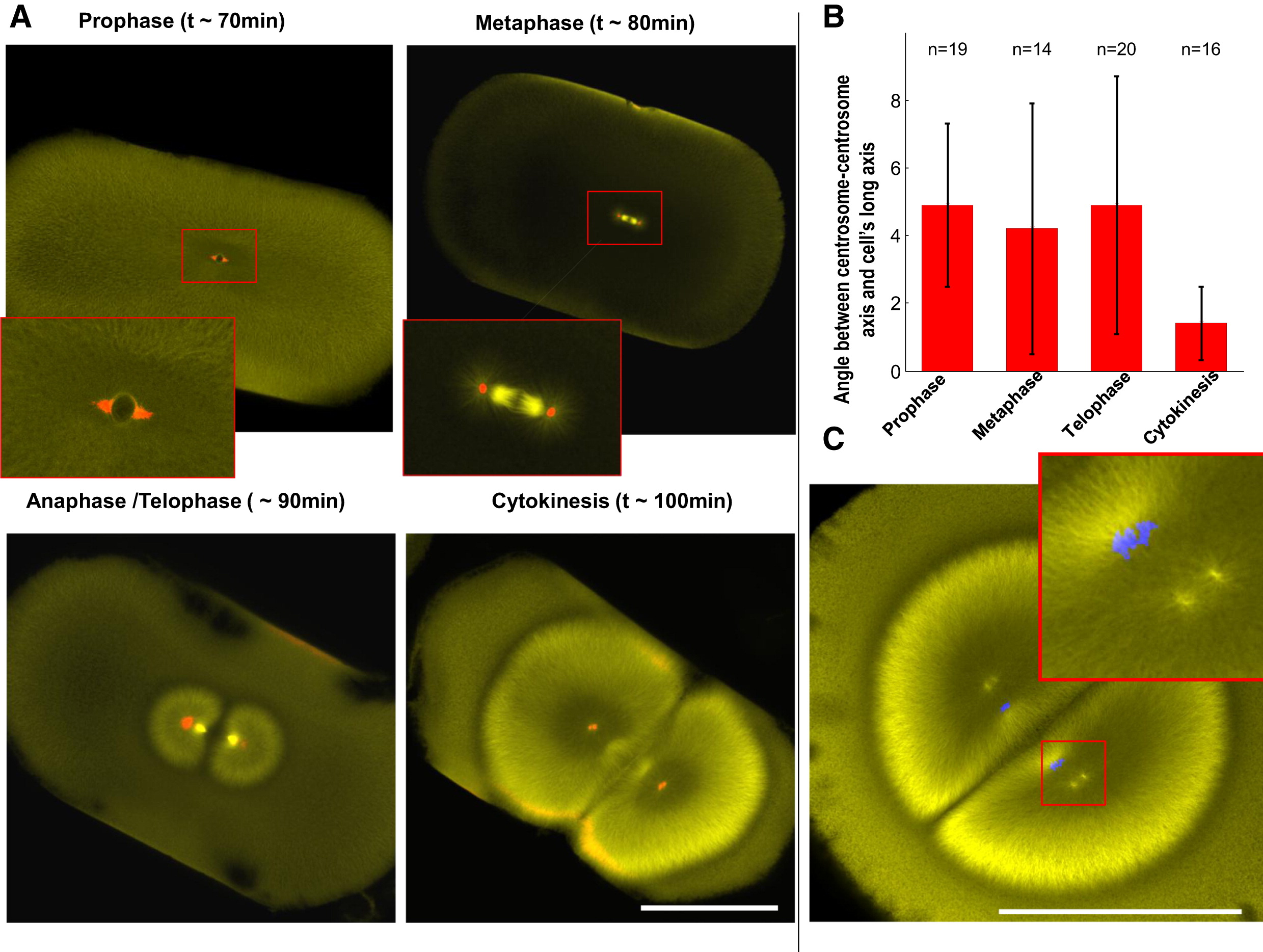 (C) α-tubulin (yellow) immunofluorescence in a frog embryo at anaphase-telophase of first mitosis, before cytokinesis. Duplicated centrosomes are already aligned parallel to the longest axes of the daughter cells. DNA (blue) follows centrosomes.