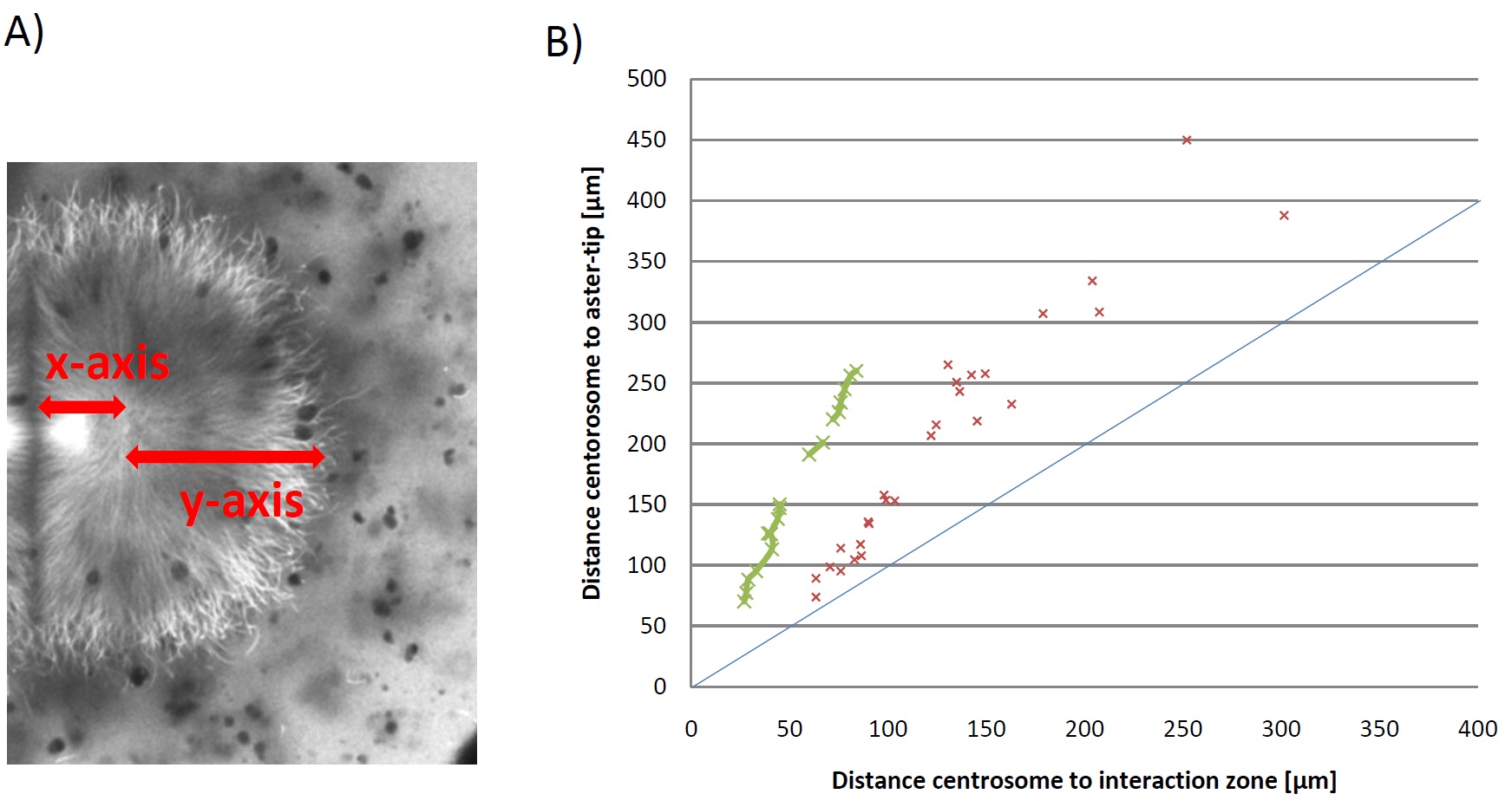 Figure S2. Related to Figure 2. Length asymmetry in telophase asters at 1st mitosis in frog and fish embryos. A) Definition of axes plotted in B. Distance of Interaction-zone to centrosome (x-axis) and Centrosome to aster front in a direction normal to the interaction zone (y-axis) B) Green symbols show distances as defined in A were plotted for the first cell cycle in zebrafish from the movie S1. Red symbols show data from 29 frog embryos fixed during anaphase/telophase of the first cell cycle. The blue line would be equivalent to a symmetrical aster (slope=1). All data-points are above the blue line, showing the asters are always longer (from centrosome to periphery) on the freely expanding side compared to the side facing the interaction zone. This is consistent with our length dependent pulling model for aster movement.