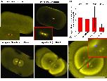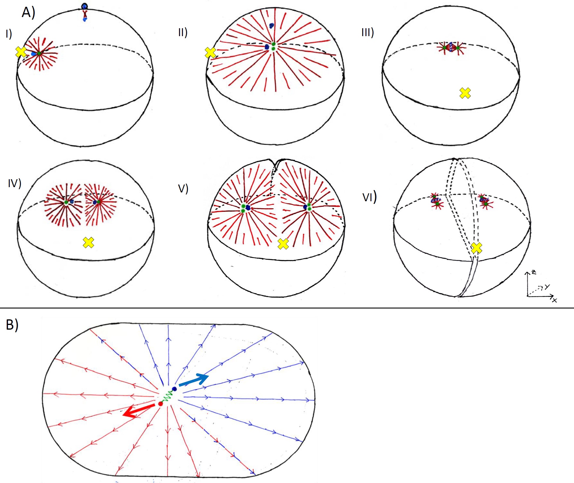 Figure S4. Related to Figure 4. A cartoon summarizing our understanding of microtubule organization in frog embryos based on published [3, 13] and unpublished micrographs. I) Fertilization triggers the continuation of the egg’s cell cycle, which was arrested at metaphase of meiosis 2. The small meiotic spindle at the top (animal pole) of the egg enters anaphase. The female pronucleus (blue) is deposited close to the animal pole. The sperm enters randomly at upper half of the egg (sperm entry point in yellow) delivering the centrosome (green) and male pronucleus. The centrosome initiates the outgrowth of microtubules (red) resulting in the sperm aster. II) The center of this aster moves towards the center of the cell. Male and female nuclei move along microtubules and meet at the center of the aster. Yolk content is higher at the bottom of the egg which biases centering towards the top III) At the onset of the first mitosis the sperm-aster breaks down and from the deposited centrosomes and DNA a relatively small first mitotic spindle forms (embryos from C onwards are rotated by 90° around the z-axis for ease of drawing). Typically the first mitotic spindle forms parallel to the tangent of the sperm entry point. IV, V) Upon anaphase the two small asters of the spindle start to grow out, but do not grow into each other due to a region of reduced microtubules density that forms where the asters overlap. We call these asters telophase-asters, and the region between them interaction zone. The centers of the asters move apart towards the center of the future daughter cells. VI) The cleavage furrow constricts where the interaction zone meets the cortex. Upon entry to second mitosis the telophase-asters break down and the second mitotic spindles form centered and oriented along the longest axis of the cells. B) Model how a pair of centrosomes could align with an aster’s long axis e.g. in a compressed embryo at the one cell stage