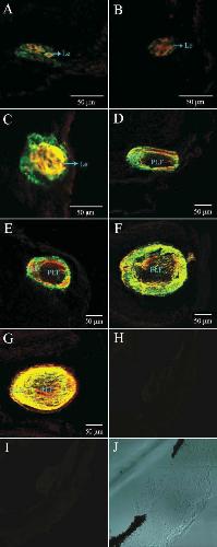 Figure 5. Immunofluorescence for αA-crystallin and βB1-crystallin during the lens regeneration. The images show the distribution of αA-crystallin and βB1-crystallin in the process of the regeneration, analyzed by confocal microscopy. The regenerated lenses were dissected at operation: 3 days, 5 days, 7 days, 9 days, 11 days, 15 days, and 21 days, as is shown in A-G, respectively. Negative controls: H (only primary antibodies); I (only secondary antibodies); J: differential interference contrast (DIC). Abbreviations: Le, lens; PLF, primary lens fiber; SLF, secondary lens fiber.