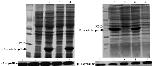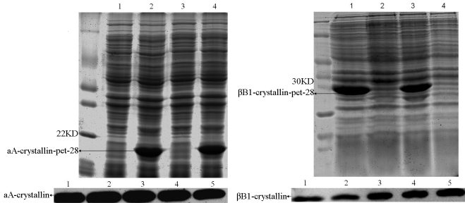 Figure 1. SDS–PAGE for induced expression of recombinant proteins (αA-crystallin-pet28, βB1-crystallin-pet28) and western blotting analysis for the two specific antibodies. Recombinant proteins were expressed in E. coli Rosetta (DE3). Their respective molecular weigh are 19 kDa and 23 kDa. In western blotting analysis, sample 1, 2, and 3 are total lens proteins; samples 4 and 5 are purified fusion proteins. By results, good specificity is shown.