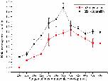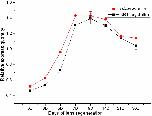 Figure 2. Real-time PCR analysis for transcripts of αA-crystallin and βB1-crystallin during the lens development. Stages are according to the normal table of Nieuwkoop & Faber. The red curve illustrates the relative expression of transcripts of αA-crystallin. From the beginning of expression at stage 26 to stage 38, it displayed an increasing trend. After stage 38, the expression began to decrease. Finally, the expression quantity maintained at a relative stable level. The same went for βB1-crystallin, which is shown by the black curve.