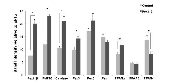 Figure 1. Overexpressing HA-Pex11β altered peroxisome related gene expression in Xenopus A6 cells. RT-PCR analysis of peroxisomal genes was performed before and after transfection of A6 cells with HA-Pex11β. Two days following transfection 250 ng of reverse-transcribed A6 cell RNAs from control and treatment samples (n = 3) were subject to PCR amplification using specific primers for the peroxisome related genes; Pex11β, PMP70, catalase, Pex5, Pex3, Pex1, PPARα, -δ, and -γ. The respective mRNA levels represent measures of mid-log phase RT-PCR product band intensities, relative to levels of EF1α. Genes whose levels were altered significantly, as assessed by an independent samples t-test, are denoted with an asterisk. Pex11β, PMP70, catalase, Pex5 and PPARα displayed elevated levels of expression following treatment, while PPARγ displayed reduced expression. P < 0.05, n = 3. Values presented are the means ± SE.