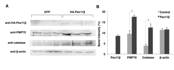 Figure 2. Overexpression of HA-Pex11β in A6 cells increased catalase and PMP70 protein levels. Western blotting revealed elevated proteins levels of catalase and PMP70 following the transfections of HA-Pex11β, but not GFP, in three samples of A6 cells (A). An HA antibody confirmed the translation and presence of HA-Pex11β in transfected cells (right 3 lanes) versus GFP transfected control cells (left 3 lanes). Catalase and PMP70 antibodies also displayed altered band intensities of each respective protein in HA-Pex11β transfected cells (right 3 lanes) versus GFP transfected cells (left 3 lanes). Protein loading in each lane was confirmed via a β-actin antibody. The Western blot signals were digitized and data were quantified and analyzed to statistically compare protein levels (B). There was a significant increase in the levels of catalase and PMP70 following overexpression of Pex11β, while there was no difference in the levels of β-actin. Statistical relevance of discrepancies between groups (asterisks) was assessed by an independent samples t-test. P < 0.05, n = 3. Values presented are the means ± SE.