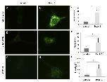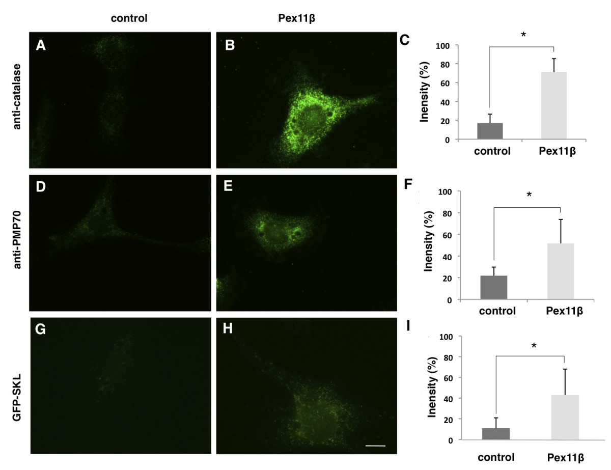 Figure 3. Overexpression of HA-Pex11β in A6 cells increased peroxisome numbers. A, D, G are untransfected cells, while B, E, H have been transfected with HA-Pex11β. G and H are additionally transfected with GFP-SKL. Using identical imaging and photography parameters, indirect immunofluorescence using a catalase antibody revealed lower levels of immunofluorescence in untransfected cells (A) versus transfected (B) cells. Similarly, indirect immunofluorescence using a PMP70 antibody revealed lower levels of signal in untransfected cells (D) versus transfected (E). Direct fluorescence for GFP revealed a diffuse signal from GFP in HA-Pex11β untransfected cells, (G) versus the presence of punctate structures in HA-Pex11β transfected cells (H). All images were captured using identical fluorescent settings. The relative fluorescence intensity in 10 regions of twenty randomly imaged cells was quantified using Northern Eclipse software. Graphs on the right represent the average fluorescence intensity of untransfected versus HA-Pex11β transfected cells. Values presented are the means ± SE. Significance at P < 0.05 was determined using Student's t-test, n = 25.