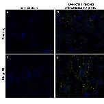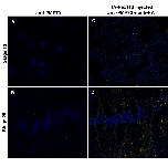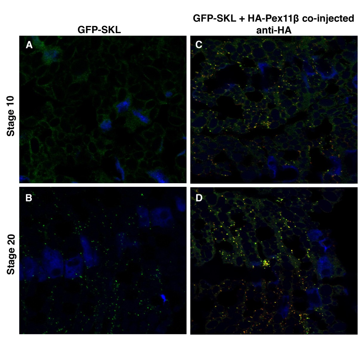 Figure 8. Microinjecting HA-Pex11β RNA increased the number of peroxisome-like GFP-SKL structures during X. laevis embryogenesis. Both control (A and B) and HA-Pex11β injected (C and D) embryos at developmental stages 10 (A and C) and 20 (B and D), were fixed then sectioned for immunohistochemical analysis in somites for GFP-SKL. At stage 10, GFP fluorescence is present as a faint diffuse stain under control conditions (A), whereas following microinjection of HA-Pex11β punctate GFP structures could be seen at this early stage (C). At stage 20, punctate GFP structures were detected in both control and following microinjecting HA-Pex11β, where numbers were increased in the injected samples. An HA antibody was also used to confirm the ectopic presence of HA-Pex11β. DAPI (blue), GFP (green), HA-Pex11β (red), colocalization of HA-Pex11β and GFP-SKL (yellow). Images were taken at 60magnification.