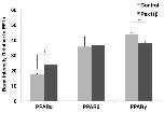 Figure 5. Overexpression of HA-Pex11β did altered PPARα and γ, but not δ, gene expression during early X. laevis embryogenesis. The respective mRNA levels represent measures of mid-log phase RT-PCR product band intensities, relative to levels of EF1α. Using a similar approach and analysis as used in Figure 4, RT-PCR analysis of RNA isolated from control stage 10 embryos and HA-Pex11β injected embryos revealed significant changes in the expression of PPARα, and PPARγ, but not PPARδ. PPARα levels were elevated by treatment, while PPARγ levels were reduced. P < 0.05, n = 3. Values presented are the means ± SE.
