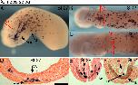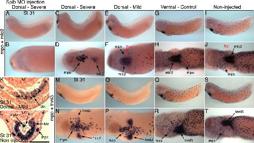 Fig.3. Spib morpholino affects myeloid cell production and also cardiac muscle morphogenesis. (AâJ) Stage 31 tadpoles injected with Xtspib-e1i1MO into dorsal blastomeres (AâF), 40 ng dose, or control ventral blastomeres (G and H), or non-injected sibling (I and J), hybridized with probes for mpo and mlc2 (myocardium). Two tadpoles with severe macrophage deficit are shown (AâD) and one with a milder reduction (E and F). Myocardial phenotype severity appears linked to the number of functional macrophages produced. Anterior is to left in lateral views and ventral view of heart-forming regions. (K and L) Transverse section through the myocardium of the mild phenotype tadpole (E, F, K) compared with non-injected control (I, J, L), Nuclear-Fast Red counterstained (NFR). Section plane indicated (Sp). Scale bar = 100 μm. En, endoderm; Mc, myocardium; Ec, endocardium. (MâT) Stage 31 tadpoles injected with the spib morpholino, 40 ng dose and with same sequence of blastomere injections presented. Tadpoles hybridized to mpo and tnni3 (myocardium). One tadpole is shown with severe macrophage deficit (M and N) and one with a milder reduction (O and P).