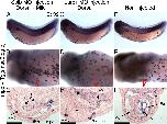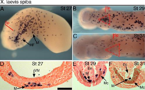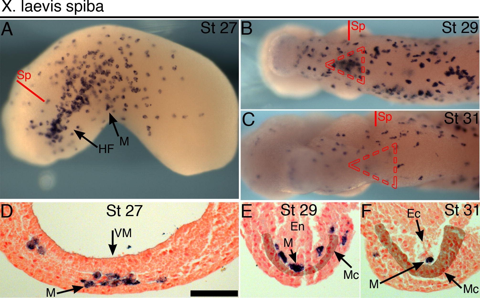 Fig.4. Spiba mRNA expression within the heart-forming region. (AâC) Wholemount in situ hybridization for myeloid spiba, ventral views of heart-forming region, at stage 27 (A), stage 29 (B) and stage 31 (C). Red triangle depicts position of forming myocardium (B and C). (DâF) Transverse sections through heart region of same embryos, with section planes depicted (AâC). Stage 27 (D), stage 29 (E) and stage 31 sections (F). To ease identification, the approximate position of the (myocardial) mesoderm has been artificially-darkened (E and F). NFR (DâF) nuclear counterstained. Scale bar = 100 μm. Sp, section plane; M, myeloid/macrophage; HF, heart field; Mc, myocardium; Ec, endocardium; VM, ventral midline; En, endoderm.