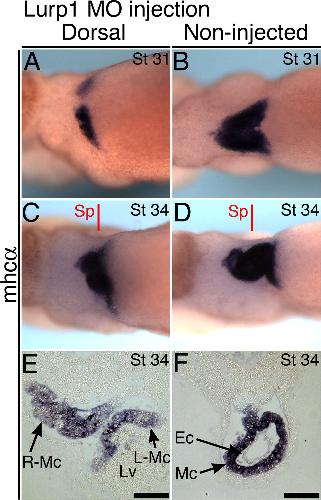 Fig.6. Lurp1 morpholino disrupts myocardial morphogenesis prior to heart tube formation. (AâD) Tadpoles injected with the lurp1-MO into dorsal blastomeres, 12 ng dose, at stage 31 (A) and stage 34 (C), compared with non-injected sibling embryos (B and D). Tadpoles hybridized to mhcα (myocardium). Anterior is to left in ventral view of heart-forming regions. (E and F) Heart section of the stage 34 tadpole with dorsal blastomere morpholino and flat, bilateral myocardium (C and E), compared with control stage 34 tadpole (D and F). No counterstain. Scale bars = 100 μm. Sp, section plane; L, left; R, right; Mc, myocardium; Ec, endocardium; Lv, liver.