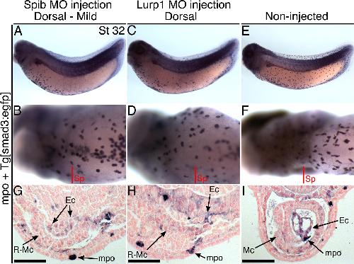 Fig.7. Endocardial smad3 expression is detected in macrophage-morpholino defective embryos. (AâF) Tadpoles injected into dorsal blastomeres with spib morpholino, 40 ng dose (A and B), or lurp1 morpholino, 12 ng dose (C and D), or non-injected sibling (E and F). The spib morpholino caused a mild macrophage deficit phenotype (A and B) while the lurp1 morpholino induced abnormal, broadened morphology at the ventral midline (D). Tadpoles carry the Tg[smad3-egfp] reporter and were hybridized with probes for mpo and eGFP. At stage 32, the transgenic line gives eGFP expression within head, eye, pronephros, somite and notochord domains (A, C, E), while strong expression occurs in the forming endocardium, but not in myocardium at these stages, nor in macrophages. Anterior is to left in lateral views and ventral view of heart-forming regions. (GâI) Transverse heart sections of the tadpoles. Cells underlying the malformed myocardium gave endocardium-type smad3 reporter expression in morpholino tadpoles (G and H) while the forming endocardium stained strongly positive in the control (I). The right-sided myocardial region only, was presented for the morpholino injected tadpoles due to their broader ventral surface and to allow the necessary image magnification. NFR-counterstained. Scale bars = 100 μm. Sp, section plane; R, right; Mc, myocardium; Ec, endocardial cell activity.
