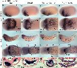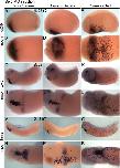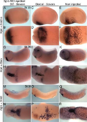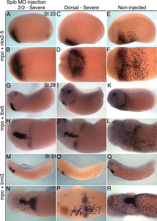 Spib morpholino comparison of bilateral versus dorsal blastomere injection. (A): Tailbud stage 23 embryos injected with Xtspib-e1i1MO, 40 ng dose, into both blastomeres at the two-cell stage (2/2, A and B), into dorsal blastomeres (C and D), or non-injected control (E and F). Embryos hybridized with probes for mpo and nkx2-5. (G): Late tailbud stage 28 embryos, with the same sequence of spib morpholino blastomere injections presented and hybridized to mpo and tbx5. (M): Stage 31 tadpoles with the same sequence of spib morpholino blastomere injections and hybridized to mpo and tnni3. Different morpholino injected embryos were chosen for presentation compared to Fig. 2 and Fig. 3.