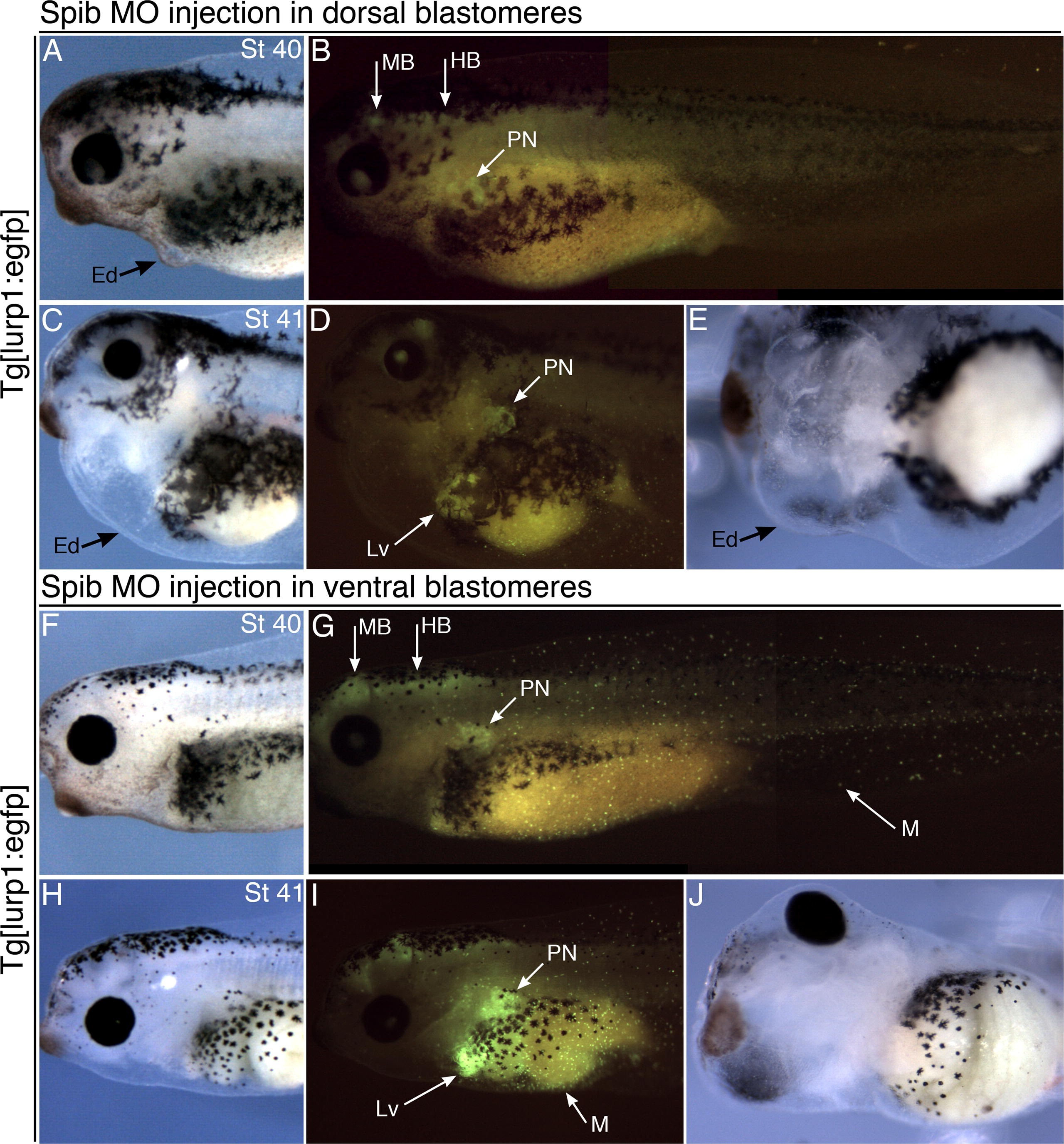Fig.1. Heart defect in a tadpole after sustained spib morpholino inhibition of myeloid cell differentiation. (AâE) X. laevis Tg[lurp1:egfp] tadpole that was injected with Xtspib-e1i1MO into dorsal blastomeres, 40Â ng dose. Tadpole was photographed at stage 40 (A and B) and stage 41 (CâE), with fluorescence from eGFP shown (B and D). The complete inhibition of myeloid cell differentiation caused by loss of spib has been sustained to stage 40. A large edema formed during this time interval, indicative of cardiac dysfunction (A, C, E). (FâJ) Control sibling tadpole that was injected with the same morpholino into ventral blastomeres, photographed at stage 40 (F and G) and stage 41 (HâJ). Fluorescent embryonic macrophages can be seen distributed throughout the tadpole (G and I). Hematopoiesis also observed in pronephros and liver (G and I). No edema developed and heart morphology appeared normal. Anterior is to the left in lateral (AâD, FâI) and ventral (E and J) views. Ed, edema; M, myeloid/macrophage; PN, pronephros; Lv, liver; MB and HB, additional domains of Tg[lurp1:egfp] fluorescence in mid and hindbrain.