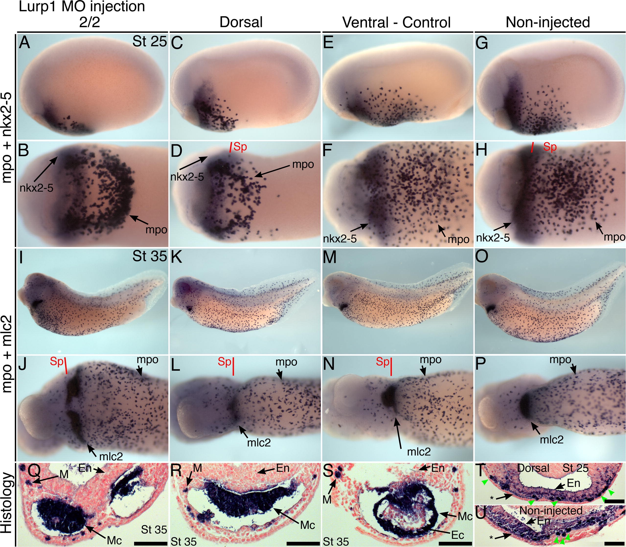 Fig.5. Lurp1 morpholino affects myeloid domain migration and cardiac muscle morphogenesis. (AâH) A stage 25 embryo injected with the lurp1-MO into both blastomeres at the two-cell stage (2/2) (A and B), 12 ng dose. Embryos similarly injected into dorsal blastomeres (C and D), or as a control in ventral blastomeres (E and F), or non-injected sibling (G and H) and hybridized with probes for mpo and nkx2-5. (IâP) Stage 35 tadpoles injected with the lurp1 morpholino, 12 ng dose, with the same sequence of blastomere injections presented and hybridized to mpo and mlc2. Anterior is to the left in lateral and detail ventral views. (QâS) Transverse section through the heart region of tadpoles injected with lurp1 morpholino. Examples of a cardiac bifida phenotype (I, J, Q) and abnormal myocardial folding morphogenesis (K, L, R) were observed in both the two-cell stage and dorsal blastomere injection experiments but never after ventral blastomere injection (M, N, S). (T and U) Stage 25 heart field sections of embryo with dorsal blastomere morpholino (C, D, T) and non-injected sibling (G, H, U). Green arrowheads show dark mpo stain of macrophages. Asterisk (*) denotes mesodermal nkx2-5 stain. NFR-counterstained. Scale bar = 100 μm. Sp, section plane; M, myeloid/macrophage; En, endoderm; Mc, myocardium; Ec, endocardium.