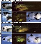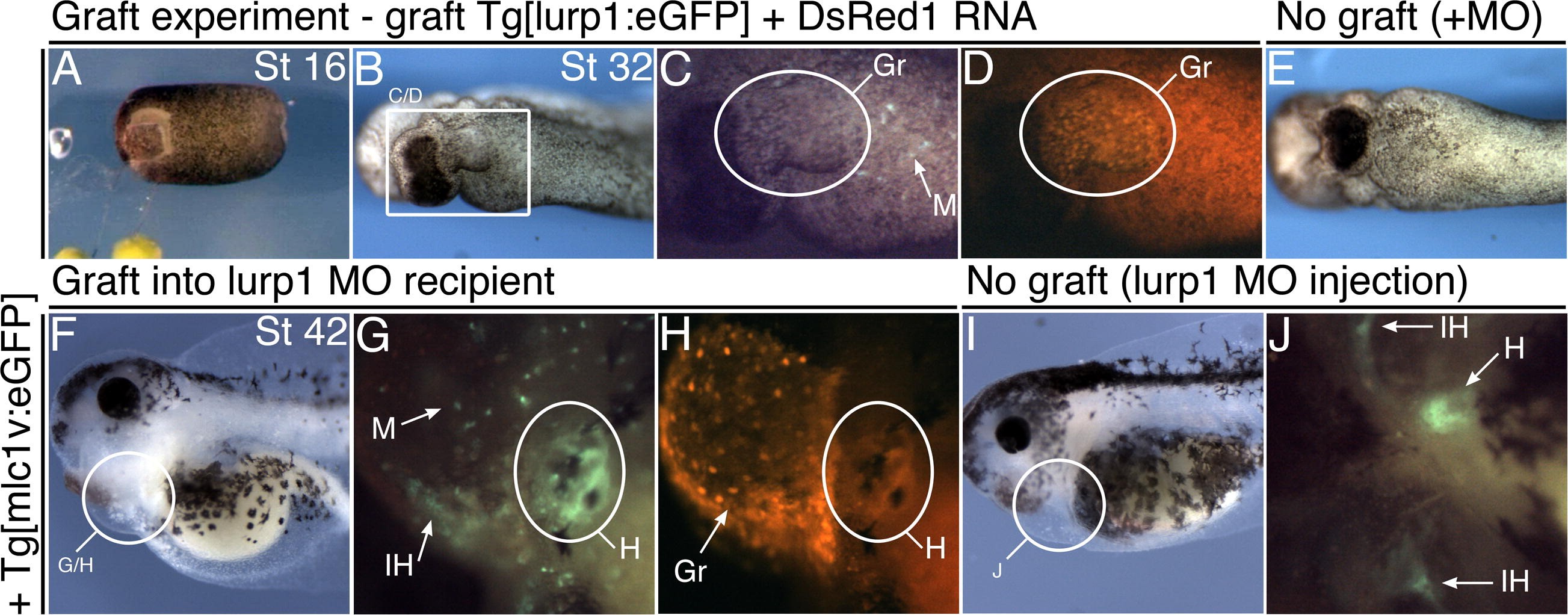 Fig.8. Tissue replacement surgery recovers heart formation defects of macrophage-morpholinos. (AâD) Anterior-ventral tissue replacement surgery was performed at stage 16 between a donor embryo and a recipient embryo (A, Supplementary Movie 1, see Section 4). The donor carries the Tg[lurp1:egfp] transgene and had been injected with DsRed1 RNA into 2/2 blastomeres. The recipient embryo carries the Tg[mlc1v:egfp] transgene and was injected with the lurp1-MO into dorsal blastomeres, 16Â ng dose. Graft recipient tadpole at stage 32 (B). White rectangle (B) shows position of fluorescence images (C-green, migratory macrophages; D-red, graft tissue). (FâH) The same tadpole now at stage 42 has a beating heart. White circle (F) shows position of fluorescence images, ventral view (G-green, donor-macrophages and recipient-heart; H-red, graft tissue). E, I, J: Sibling tadpole injected with lurp1-MO but was not operated on, shown at stage 32 (E) and stage 42 (I and J). The remnant of myocardial tissue does not form a lumen and does not beat (J). Anterior is to left in all views. Gr, graft; M, macrophage; IH, interhyoid facial muscle; H, heart.